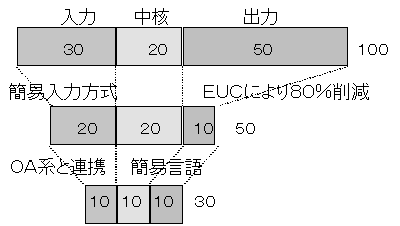 下段は,EUCが非常に普及した段階です。この段階になると,入力系はワークフロー管理システムの一部になりますので,基幹業務系システムとしては非常に簡素化されます。出力系も情報検索系システム化が進みますが,ここでは既に大部分が移行しているとして数字には入れませんでした。また,この段階ではEUCを前提としたシステム設計が行なわれますので,中核系を簡易言語やユーティリティなどで記述できるとして,20の規模が10になるとしました。