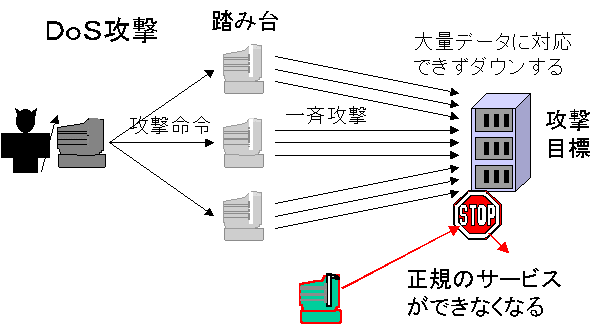 標的になるサーバに大量のデータを送りつけることにより、正規のサービスをさせないようにする攻撃です。銀行強盗が盗難車を使うように、DoS攻撃者は直接に標的を攻撃するのではありません。あらかじめセキュリティの弱いサーバにウイルスを仕掛けておきます。それを踏み台といいます。そして、攻撃者の指令により多数の踏み台になったサーバから一斉に標的に大量のデータを送りつけるのです。