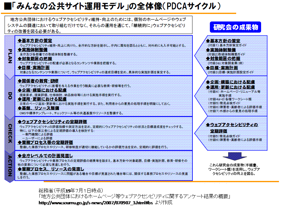- JIS X8341-3の要求事項を一挙に実現するのは困難ですし、アクセシビリティからユーザビリティへと発展させることも必要です。また、庁外関係者を含む全庁的な活動です。それで、PDCA(Plan-Do-Check-Action)による組織的かつ継続的な取り組みが重要になります。