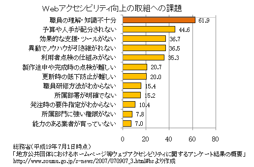 このように、WebアクセシビリティやWebユーザビリティの向上は、市政の重点項目とすべきものですが、それには多くの課題があります。総務省「地方公共団体におけるホームページ等ウェブアクセシビリティに関するアンケート結果の概要」では、Webアクセシビリティ向上の取組への課題として、次の事項を示しています。