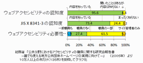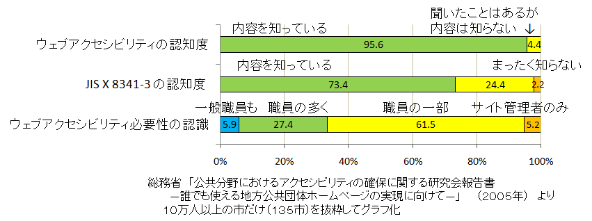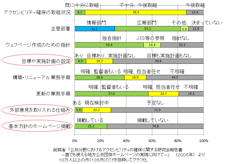 地方自治体でのWebアクセシビリティへの取り組み状況に関して、総務省「公共分野におけるアクセシビリティの確保に関する研究会報告書―誰でも使える地方公共団体ホームページの実現に向けて―」(2005年)の調査を紹介します。