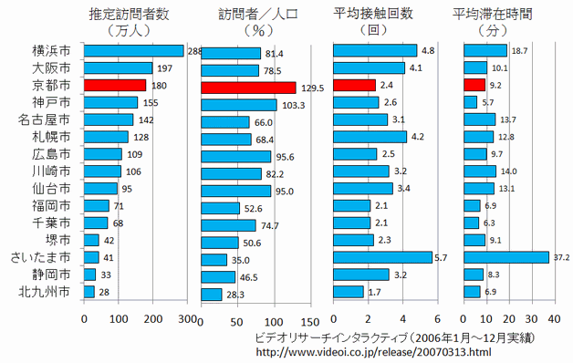 ビデオリサーチインタラクティブ(2006年1月〜12月実績)によると、他の政令都市のWebサイトと比較して「京都市情報館」へのアクセスには特徴があります。