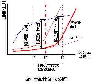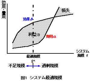 これらの関係を図示すると図1のようになる。すなわちシステム規模をf*にしたときが費用対効果が最大になり、システム規模がf*よりも小さい(左側)のときは規模不足であり、大きい(右側)のときは過剰規模である。