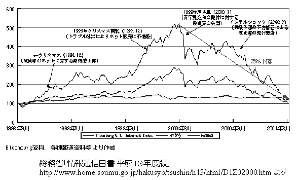 この動向は,ドットコム企業にへの無分別な投機を生み出し,過剰投資で膨大な赤字なのに株価だけが高騰するような現象を生み出しました。そんな不自然な状況が長続きするはずはありません。2000年になるとITバブルが崩壊しました。さらに2001年9月11日の同時多発テロもそれを加速しました。これで,それまでのITの神通力は消えたともいえます。しかし,これはドットコムへの過剰投機が自壊したのであり,健全な情報化投資が国家経済に与える効果は非常に高く,今後10年は成長が続くであろうとの予測が有力です(注1)。