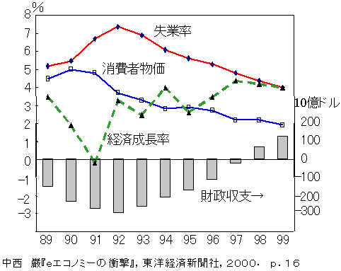 しかも,従来の経済学では,経済が成長すると失業率が低下し個人所得が増大するので物価が上昇するといわれていたのですが,IT産業の急激な拡大と企業での情報活用による合理化により,10年間の長期にわたってインフレなき経済成長が続きました。それで従来の経済理論が成立しなくなったといわれ,「ニューエコノミー」といわれるようになりました。