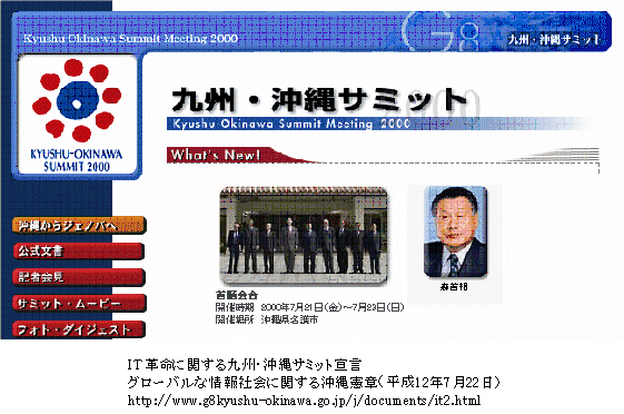 日本政府も遅ればせながら,IT革命に対応する施策を講じるようになりました。2000年7月に開催された九州・沖縄サミットでは,日本が議長国になり,ITが経済に与える影響を声高に宣言しました。IT基本法が2000年末に成立,まさに21世紀初頭である2001年1月7日に施行されました。「IT革命」は2000年の流行語大賞になりました。
