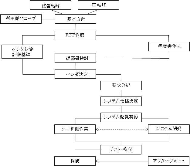 小規模なシステム以外では、システム開発をベンダに請負契約で発注するのが一般的ですので、それを前提としたシステム調達の手順を概観します。