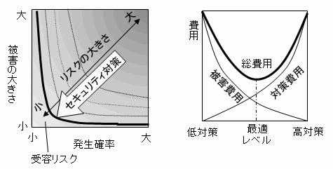 では、その受容リスクをどのレベルにすればよいかが問題になります。対策費用をかけないと被害損失が大きくなります。対策を厳重にすれば被害損失は小さくなりますが対策費用が大になります。それで、対策費用+被害損失が最小になるレベルが最適だということになります。