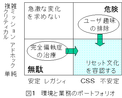 ところが、CSS環境は不安定な環境なのである。これが円滑に動かないと業務がストップするようなミッションクリティカルな用途に適用させるために、99.99%ではなく100%の信頼性を持つCSS環境を維持運営することが至上任務になる。そうなると、ユーザの自主的な利用どころか、ソフトのバージョンアップすら保守的になってしまう。すなわち、CSS環境の特質である小回りの良さは放棄されてしまう。