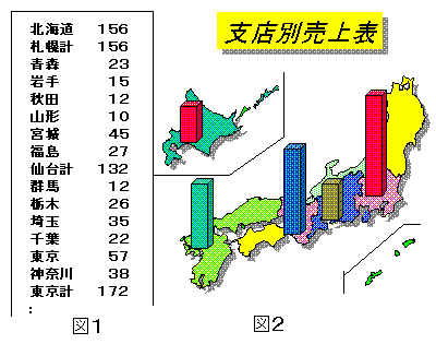 ところが、画面偏愛症のユーザはこれでは満足しない。まず表に罫線を入れたがる。小計・中計・大計の順ではなく、内訳的に大計・中計・小計の順で出したくなる。さらにはグラフにしたくなり、結局は図2のような地図にまで到達してやっと満足する。当初から図2を作ろうとするのならば、30分から1時間もあればできるかも知れない。ところが、まず図1画面を見て、罫線を入れ、行の順序を入れ替えて罫線を引き直し、棒グラフや折れ線グラフ、3Dグラフと試行錯誤してから地図に気がつき、そのデザインをいろいろと変えたりするので、手計算で必要とした時間と同じ時間を使ってしまう。というよりも、「仕事はそれに与えられた時間を使い果たしたときに完成する」のである。コンピュータを用いても手計算でも生産性は変化しない。