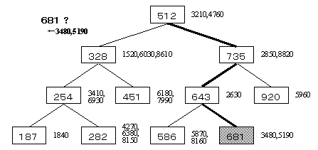 通常のRDBでのインデクスでは,B-tree型のインデクスが広く利用されています。これは,図のように,キーとなる項目の値の大小関係により,2分木をたどって求める項目要素を探し出す方法です。キーとなる項目が「商品」などキーの値が多く(図3-2では11個であるが,実際には数千にもなる),一つの値(681)についてのデータの個数(ここでは,3480と5190の2つ)が少ないときは,B-treeは効果的です。