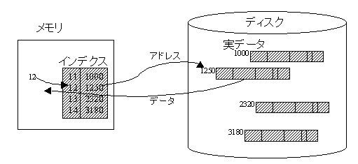 ある条件に合致したレコードを探すときに,テーブルの先頭から順に探したのでは時間がかかりますので,該当データを直接に探す手段が必要になります。これを実現するには,商品マスタはディスクに保管してあるが,その保管場所(アドレス)と商品コードの対比表を作り,その対比表をメモリに入れておき,対比表を調べることにより,商品コード(12)に対応する保管場所(1250番地)を知り,ディスクの1250番地を直接にアクセスすればよいでしょう。補助記憶装置であるディスクから読み込む時間にくらべて,内部記憶装置であるメモリ内の処理時間は数百倍速いので,このような複雑な処理をしても,このほうが処理速度が向上するのです。このような対比表をインデクスといいます。
