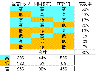 経営者・利用部門・IT部門のレベル高低がシステム成否に与える影響 (注)