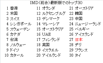 「World Competitiveness Yearbook」(WCY、世界競争力年報):毎年、約60の国・地域を対象に、統計データ、独自の調査やアンケート結果をもとに、各国・地域の競争力を評価してを発表。