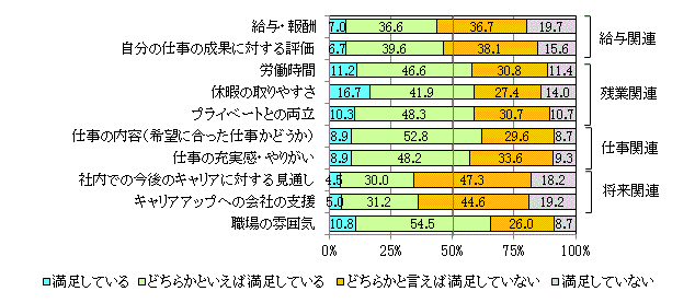 不満が多い分野:将来関連・給与関連 満足が多い分野:仕事関連・残業関連 給与に不満をもつのはサラリーマンに共通だろう。将来が不安なのは、変化が激しいためと思われる。 残業が多い職種だとされているが、当人は比較的不満に思っていないようだ。