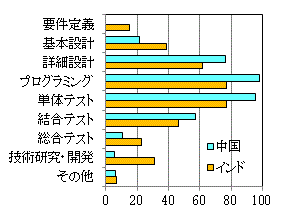 オフショア開発の主目的は「開発コストの削減」である。そのため、委託分野は詳細設計、プログラミング、単体テストなどの労力集中型の下流工程が主である。