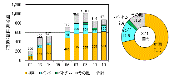オフショア開発は、景気動向によるIT開発への影響を受けるが、総じて開発コスト削減要請や国内IT人材不足を背景に増大している。回答企業以外の発注も加えれば、年間1千億円の規模になっている。