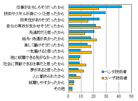 中途採用者を除けば「給与・待遇が良かったから」や「一生働けると思ったから」は社内異動の項目としては不適切なので、そのような項目では、「IT部門」を選んだ理由ではなく、「ベンダ企業」を選んだ理由を回答していることもあろう。その観点では、「ITの仕事」というより「一般の就職での理由」に似ているといえる。