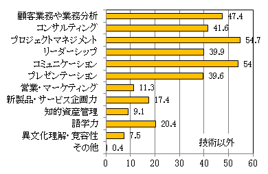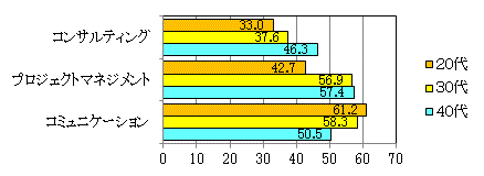 これらを円滑に行うには、顧客やメンバとのコミュニケーション、プレゼンテーションが必要になる。年齢が上がるにつれて重要性が相対的に下がるのは、その年齢になるまでに訓練されてきたからであろう。