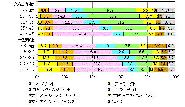 現職種も希望職種も、年齢に関係なくほぼ一定である。