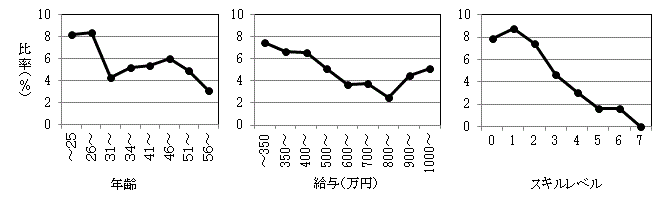 - 給与が800万円を超す頃から比率が上がるのが奇妙である。ユーザ技術者ならば、管理職として昇進するために他部門を経験したいと思うだろうが、ベンダ技術者の場合はどうなのだろうか。