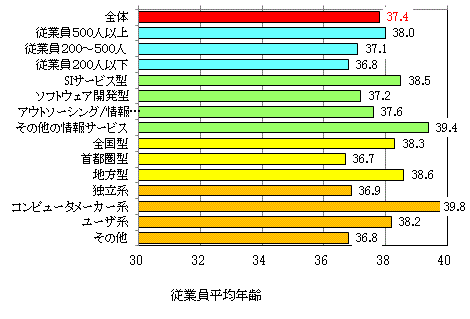 情報サービス業特性別平均年齢(JISA会員企業) (注)