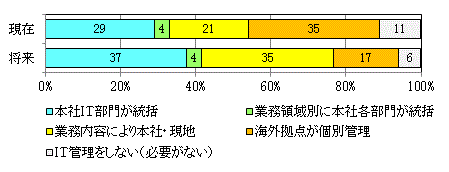 「海外の事業拠点が管理する」から「本社のIT部門で管理」へとの傾向がみられる。 「会計・インフラ」は集中管理、「人事総務・販売」は分散管理という傾向