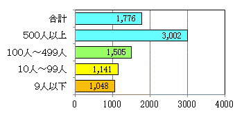 一人あたりの売上高は企業規模により異なる。特に500人以上・以下で大きく異なる。 500人以上のソフトウェア業では、システムインテグレータが多く、付加価値の高い上流工程の受注が多いからであろう。