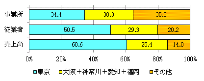 事業所数では「東京」「4県」「その他」がほぼ同数なのに、売上高では「東京」だけで60%程度のし合をもつ。大企業が東京に集中している。 顧客であるユーザ企業の本社、特に大企業の本社が東京に集中しており、そこからの受注が多いからである。