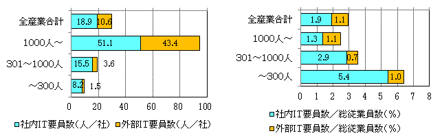 外部要員の比率が大きいのがITの特徴である。大企業では約半数が外部要員である。コンピュータの運用は外注するのが一般的だし、業務量が多いのでベンダや情報子会社から常駐でSEや専門技術者が来ている。また、プログラマなどの派遣受入もある。請負でもユーザ企業内で作業していることがある。
