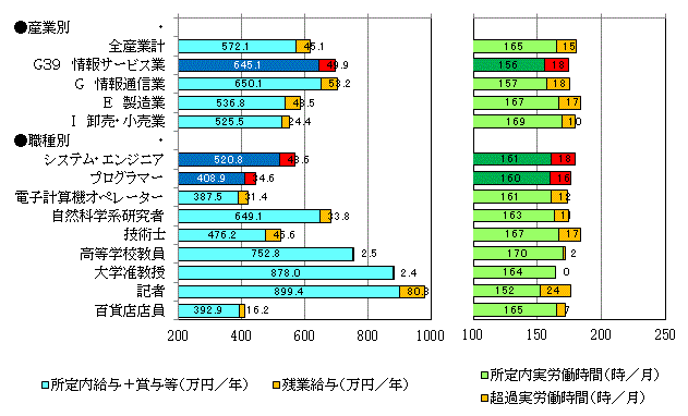 これには、この調査が6月であることも影響しているかもしれません。季節差異が少ない月を選定しているのですが、情報システムの切り替えは4月・10月実施が多いし、大規模なハードウェアの変更は連休時期に行われることが多いので、6月は情報サービス業での残業が少ない月だともいえます。