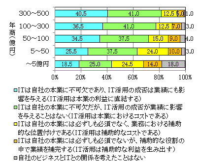 ITの利活用が本業にどの程度の影響を与えているか、すなわち、ITの重要性に関する経営者の認識である。 経営規模が小さくなるのにつれて、重要視されなくなる傾向がある。特に年商5億円未満の小規模企業においては「自社のビジネスとITとの関係を考えたことはない」という回答が突出している。年商5億円がIT活用の境界線になっている。