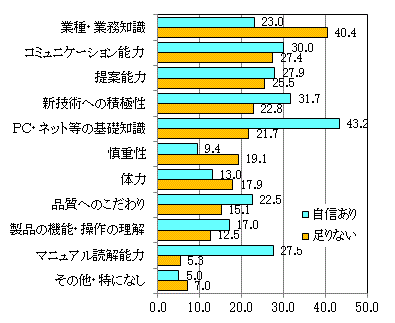 「コミュニケーション能力」が「足りない/自信がある」の双方で高いのは、その能力が重要なので「足りない」ことを痛感している人が多く、逆に、それに自信があれば、そのことを回答した人が多いからであろう。