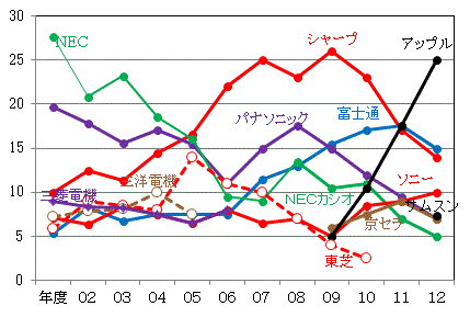 各年、上位5社のみ。6位以下の場合はグラフに表示されていない。 三菱電機:2008年に携帯電話事業から撤退 三洋電機:2008年に携帯電話事業を京セラに売却、三洋電機は2011年にパナソニックの子会社になる。 NECカシオ:2009年にNEC、カシオ、日立の携帯端末部門を統合 東芝:2012年に携帯電話部門を富士通に売却