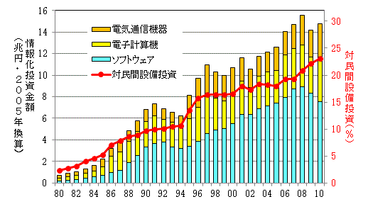 情報化投資は、景気の動向に左右されるが、総じて絶対額でも投資全体に占める割合も増大している。絶対額では年間15兆円程度になり、民間設備投資の1/4を占めるようになった。
