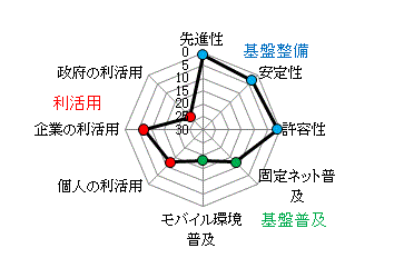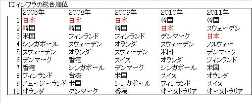 出典:(~2009年)総務省「日本のICTインフラに関する国際比較評価レポート」 2005年、 2008年、 2009年 (2010年~)総務省「ICT基盤に関する国際比較調査」 2010年、 2011年より編集