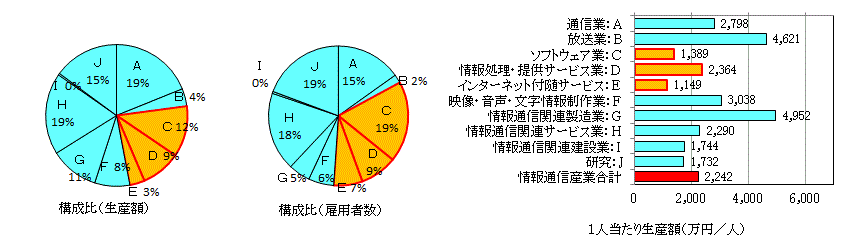 通信白書等の「情報通信産業」には、「情報サービス業」以外に、NTT、NHK・民放、コンピュータメーカーなども含んでいる。 情報サービス業が情報通信産業全体に占める割合は、生産額では1/4、雇用者数では1/3である。