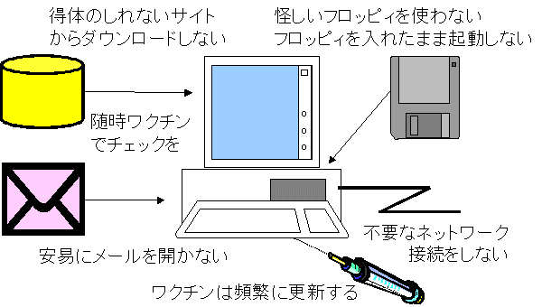 - 添付ファイルの開封、ダウンロード、フロッピー等の挿入などをするときには、ワクチンでチェックするなどの細心の注意が必要です。☆