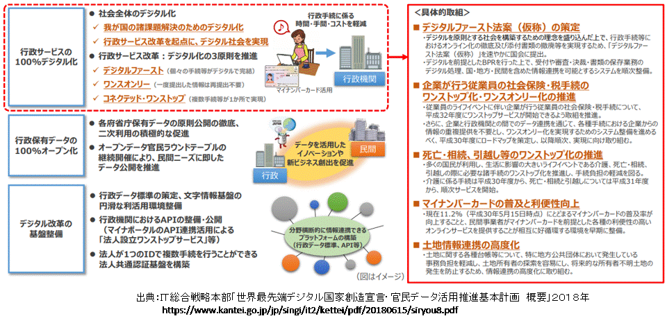 IT総合戦略本部は、2013年以降「世界最先端IT国家創造宣言」に基づいたIT戦略を推進してきましたが、2016年に成立した「官民データ基本法」を受けて、IT総合戦略本部は2017年から2019年にかけて「デジタル・ガバメント実行計画」を策定しました。