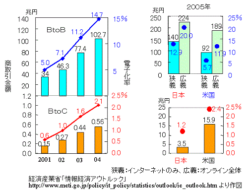 特定商取引法(2005年改訂)など,電子商取引を促進するための多くの法的措置が行われました。その効果もあり,電子商取引は,BtoB(企業間取引)でもBtoC(対消費者取引)でも,順調な発展をしてきました。