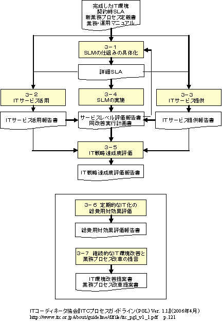 3-1.サービスレベルマネジメント(SLM)の仕組みの具体化 3-1-1.サービスレベル測定指標の決定 3-1-2.サービスレベル測定指標の捕捉タイミングと方法の決定 3-1-3.SLM要領の作成 3-2.ITサービス活用 3-3.ITサービス提供 3-4.SLMの実施 3-4-1.サービスレベル測定指標の捕捉 3-4-2.サービスレベルの評価 3-4-3.サービスレベル改善活動 3-4-4.サービスの変更要求の管理と調整 3-5.IT戦略達成度評価 3-5-1.IT戦略達成度評価指標の計測捕捉 3-5-2.IT戦略達成度の評価 3-6.定期的なIT化の総費用対効果の評価 3-7.継続的なIT環境改善と業務プロセス改革の提言 3-7-1.ITサービス提供部門の改善・提言活動 3-7-2.業務部門の改善・提言活動