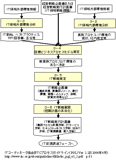 3-1. フェーズの立ち上げ 3-2. IT領域内部環境分析 3-2-1. 現行業務プロセス分析 3-2-2. 現行IT環境分析 3-2-3. 内部制約条件確認 3-3. IT領域外部環境分析 3-3-1. 近似事例調査、分析、評価 3-3-2. IT動向・実績調査、分析、評価 3-3-3. 外部制約条件確認 3-4. 目標ビジネスプロセスモデル策定 3-4-1. 目標業務プロセス策定 3-4-2. 目標IT環境策定 3-5. IT戦略策定 3-5-1. ギャップ分析 3-5-2. IT戦略策定 3-6. IT戦略展開 3-6-1. 業務プロセス改革方針策定 3-6-2. ITサービス方針策定 3-6-3. セキュリティ&リスク管理方針策定 3-6-4. モニタリング&コントロール方針策定 3-6-5. IT資源調達・導入方針策定 3-7. フェーズの完了